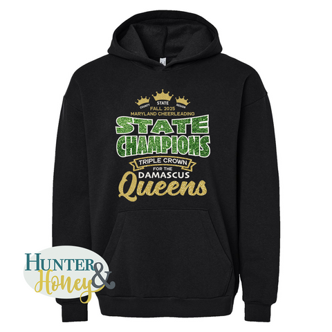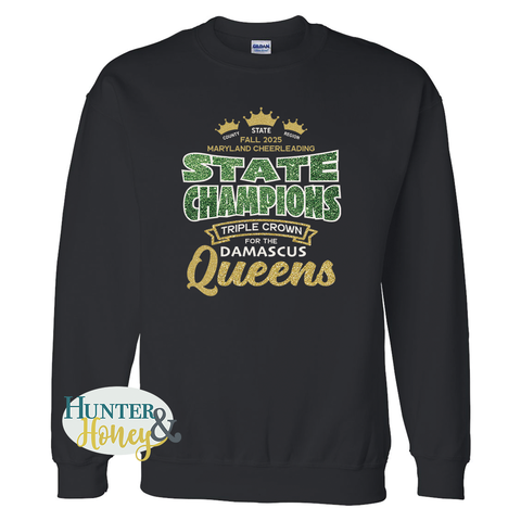 Celebrate the Damascus Cheerleading's State Champs win with this commemorative apparel. All products are feature a 3-color glitter HTV imprint. Choose between t-shirts, crewneck sweatshirts, hoodies, or straight-leg sweatpants. All items are unisex.